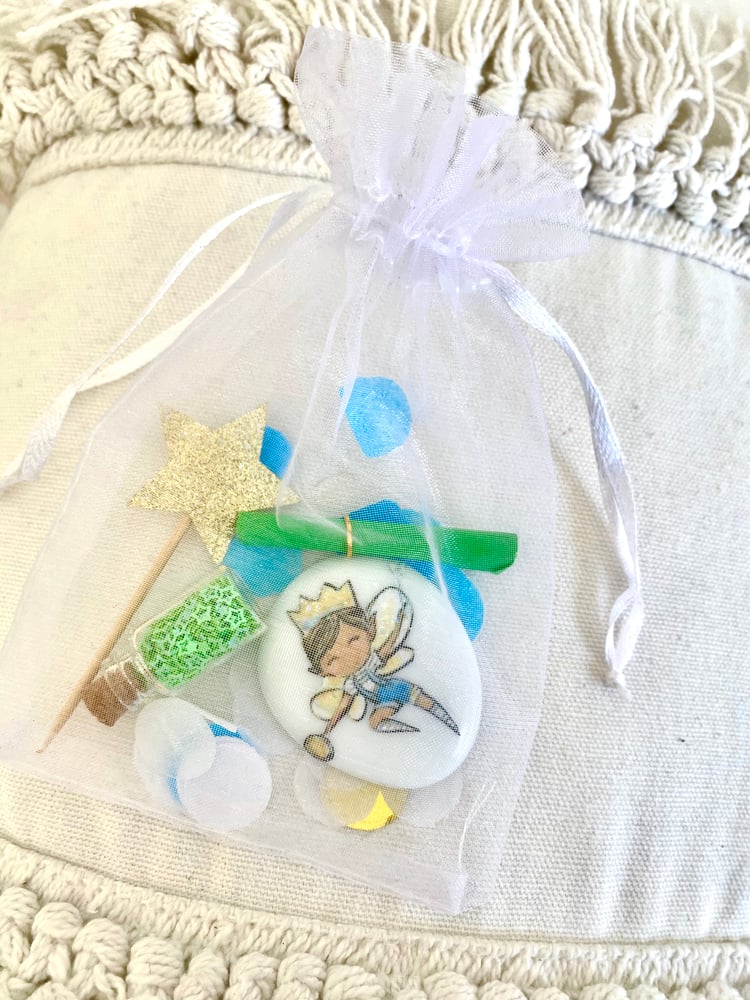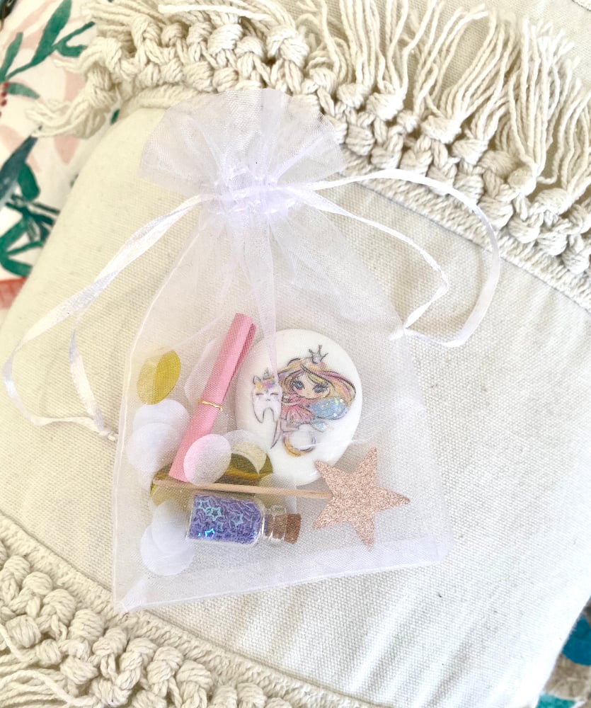 Each bag contains one tooth fairy stone, a star wand, glitter jar and a scroll note for the toothfairy to leave a little handwritten note packaged in a reusable bag with confetti.